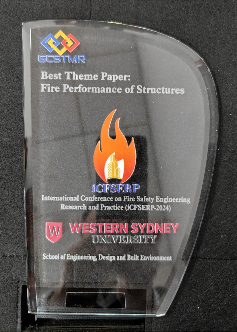 经过会议学术委员会评审,并邀请国际知名抗火专家、英国曼彻斯特大学Yong Wang教授提名推荐,课题组提交的论文“Investigation of the collapse resistance of concrete-filled square steel tubular column to H-beam connection with outer ring plate under exposure to high temperature”(王景玄为第一作者,王文达为通讯作者)获得大会的“Fire Performance of Structures(结构抗火性能)”主题唯一的“Best Paper”,获得组委会颁发的奖牌。