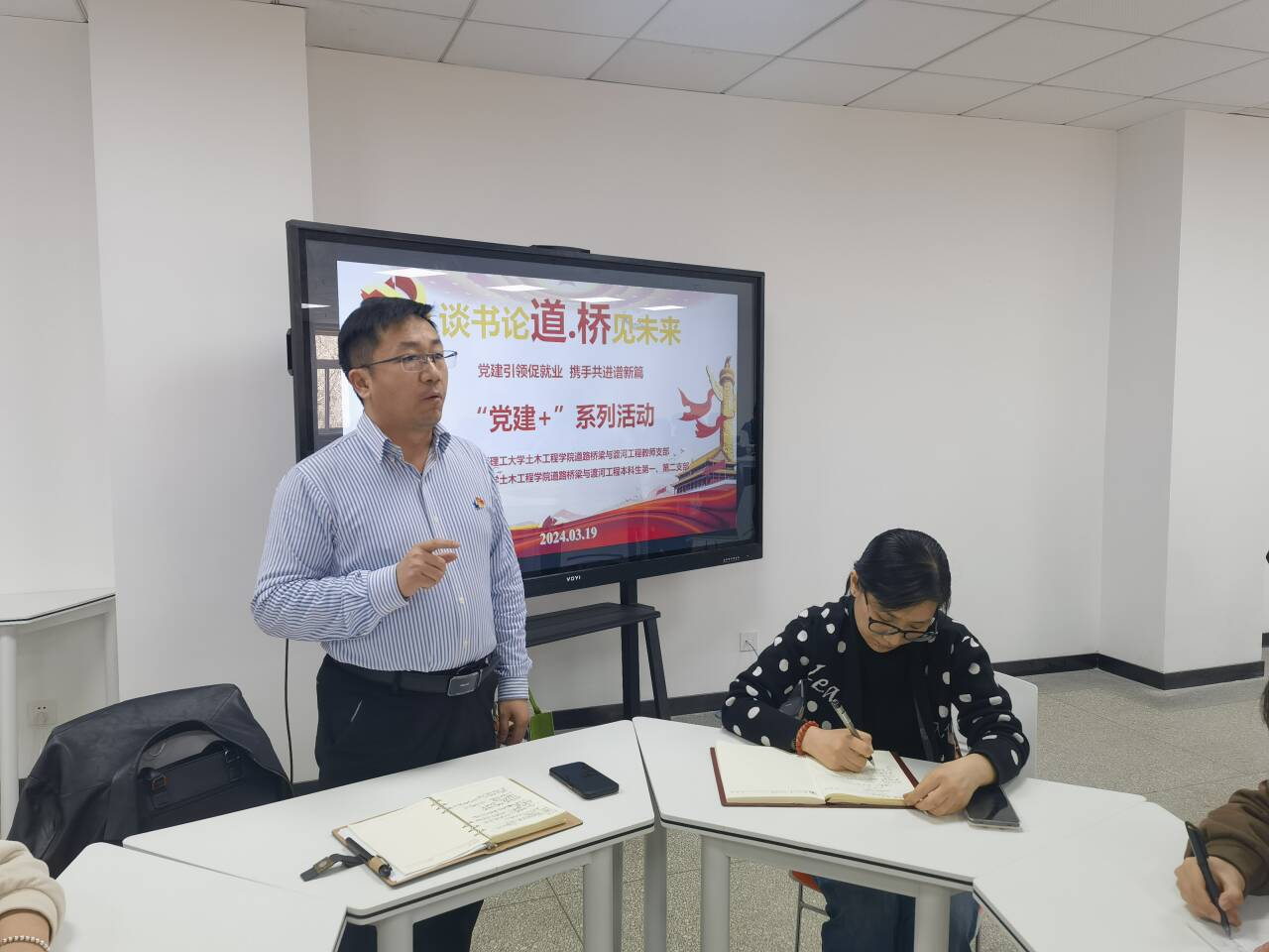 道桥系主任石岩介绍目前专业就业情况,并对员工未来规划和共建帮扶促就业措施进行说明。李万润从正确看待土木工程行业的发展、科学的就业理念等方面进行分析,引导同学们树立正确的择业观,落实高质量充分就业。教师党员和员工结对,一对一进行考研、就业、学业等方面的交流,解答员工在就业过程中的困惑。李喜梅希望全体师生以此为契机,积极行动,有效帮扶,高质量充分就业。