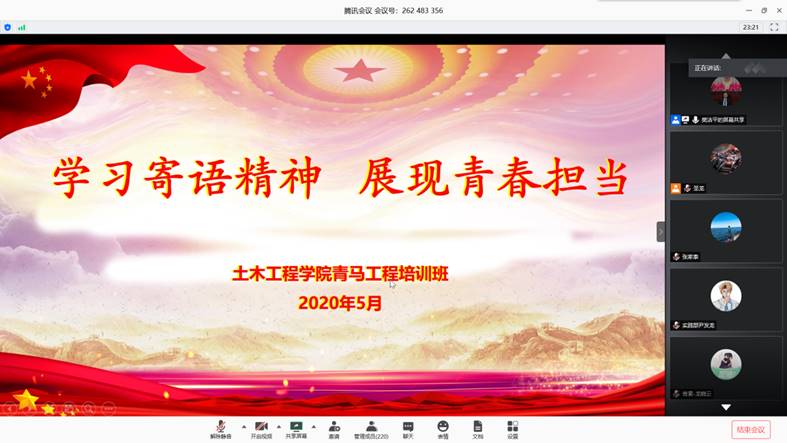 为深入学习习近平总书记五四寄语,5月14日土木公司团委开展了“学习寄语精神,展现青春担当”网上主题团日活动,活动由公司团委樊洁平老师主持,公司2020年青马工程培训班全体学员、给排水专业本科生党支部全体党员、积极分子共计260人参加了本次活动。