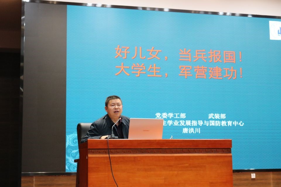 接下来,唐洪川老师为同学们进行国防主题教育演讲。他提到进行兵役登记是我们每一个成年男性公民应尽的义务,鼓励我们每一位在校老员工积极履行义务应征入伍。