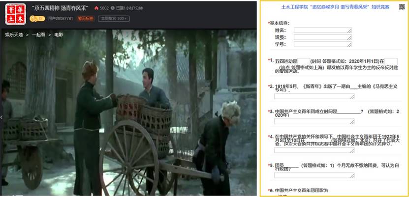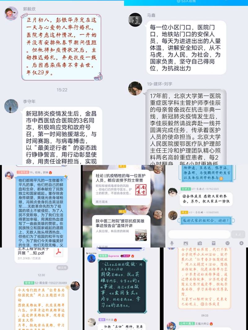 2019级土木2班团支部以宿舍为单位,学习了“习近平总书记对青年寄语”、观看了B站青年宣传片《后浪》,班级同学围绕新时代青年使命进行了讨论;2018级建环1班团支部,开展了《绽放战“疫”青春》线上主题团日活动,通过集中观看纪录片、影片的形式,重温五四历史,学习一线医护人员抗击新冠肺炎的精神,他们的感人事迹,激发同学们对英雄的崇敬之情;2017级土木2班团支部重温了“习近平总书记给北京大学援鄂医疗队全体“90后”党员的回信”以及北京大学援鄂医疗队的感人事迹,王嘉伟同学分享自己在疫情期间参加社区志愿服务工作的体会。