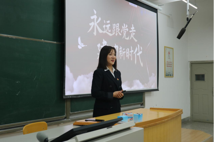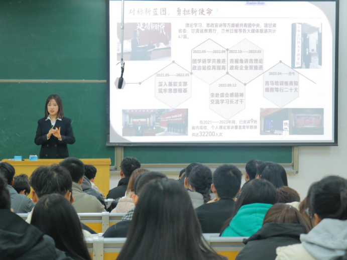 本次宣讲会由荣获2022年中国老员工自强之星、2023年甘肃省老员工年度人物、甘肃省青马宣讲团成员、甘肃省二十大精神巡讲团成员、甘肃省第十四次团代会高校代表张莹博同学进行宣讲。