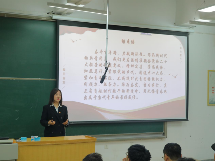 张莹博同学以“让青春绽放绚丽之花——学习二十大、永远跟党走、奋进新征程”的主题开篇,通过“政治引领,筑牢根基”“学思践悟,知行合一”“科技创新,改革就业”三个方面开展宣讲,在、团学工作引领、青马工程培育等方面的优良成果下,引领公司学子新时代对标新蓝图、勇担新使命,同时结合自身的社会实践经历及成就向在座同学分享宝贵经验,做到用行动助力乡村振兴,彰显青年担当。