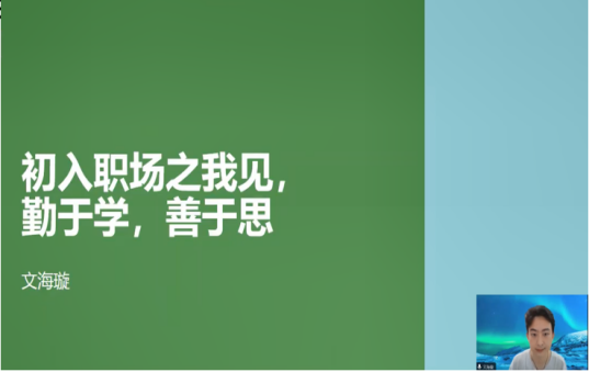 随后,高年级员工代表分别就自己的本科学习生活和毕业就业经历分享自己的心得体会。首先,20级本科生彭耀清以“我的大学时光”为题,分享了自己的本科学习经验与方法,他从“能力、动机、心态、机遇”四个方面并结合自身经历为大家介绍本科阶段的学习方法与感悟,建议同学们要远离“内耗”,学会自我调节,以积极的心态面对学习和生活;要正确看待并对待竞争。随后,工作在中国铁建港航局第一工程分公司的19级毕业生文海璇回忆了自己的学习经历,详细地为同学们介绍了自己从员工时代到就业以来的所思所想和工作现状,他希望同学们要在充分发挥个人优势的同时学会尊重他人,在工作中培养自己的沟通协调能力,努力发挥自己的价值。