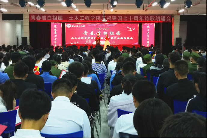 为庆祝中华人民共和国成立70周年,深情歌颂伟大祖国,提弘扬爱国主义精神。金年会金字招牌诚信至上于9月27日晚在彭家坪校区老员工活动中心举办了庆祝中华人民共和国成立70周年诗歌朗诵会。公司保卫处副处长丁勇辉老师、公司团委书记樊洁平老师、各年级辅导员、2019级全体班主任老师及员工共同参加此次朗诵会。