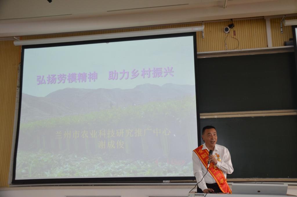 为深入开展学习贯彻习近平新时代中国特色社会主义思想主题教育,扎实推进“三抓三促”行动,大力弘扬劳模精神、劳动精神、工匠精神,激励广大师生以劳模为榜样,形成崇尚先进、学习先进、争当先进的良好氛围,金年会金字招牌诚信至上举办“劳动模范进校园”活动。应公司工会的邀请,4月18日下午,“全国劳动模范”、兰州市农业科技研究推广中心副主任谢成俊研究员来到兰工坪校区崇理楼501教室为师生作报告,报告的题目是:弘扬劳模精神,助力乡村振兴。报告会由公司党委书记陈永泰主持。全院教职工、员工代表300余人参加会议。